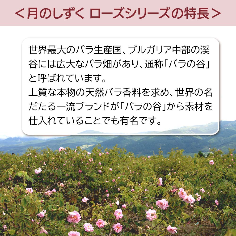 その「バラの谷」から届いた貴重な朝摘みオーガニック・ダマスクローズウォーターを、「月のしずく ローズシリーズ」にはたっぷりと配合。