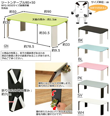 商品番号 WFG-9050 商品説明 完成品 豊富なカラバリが嬉しいツートンカラーのローテーブル! 使い勝手の良い90cm幅!折りたたみ式で収納も簡単です! 天板と脚の色を変えた可愛くて実用的なツートンテーブル。